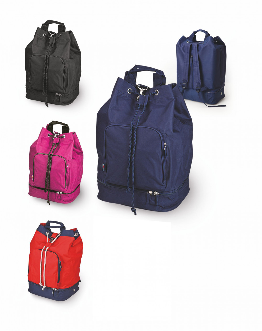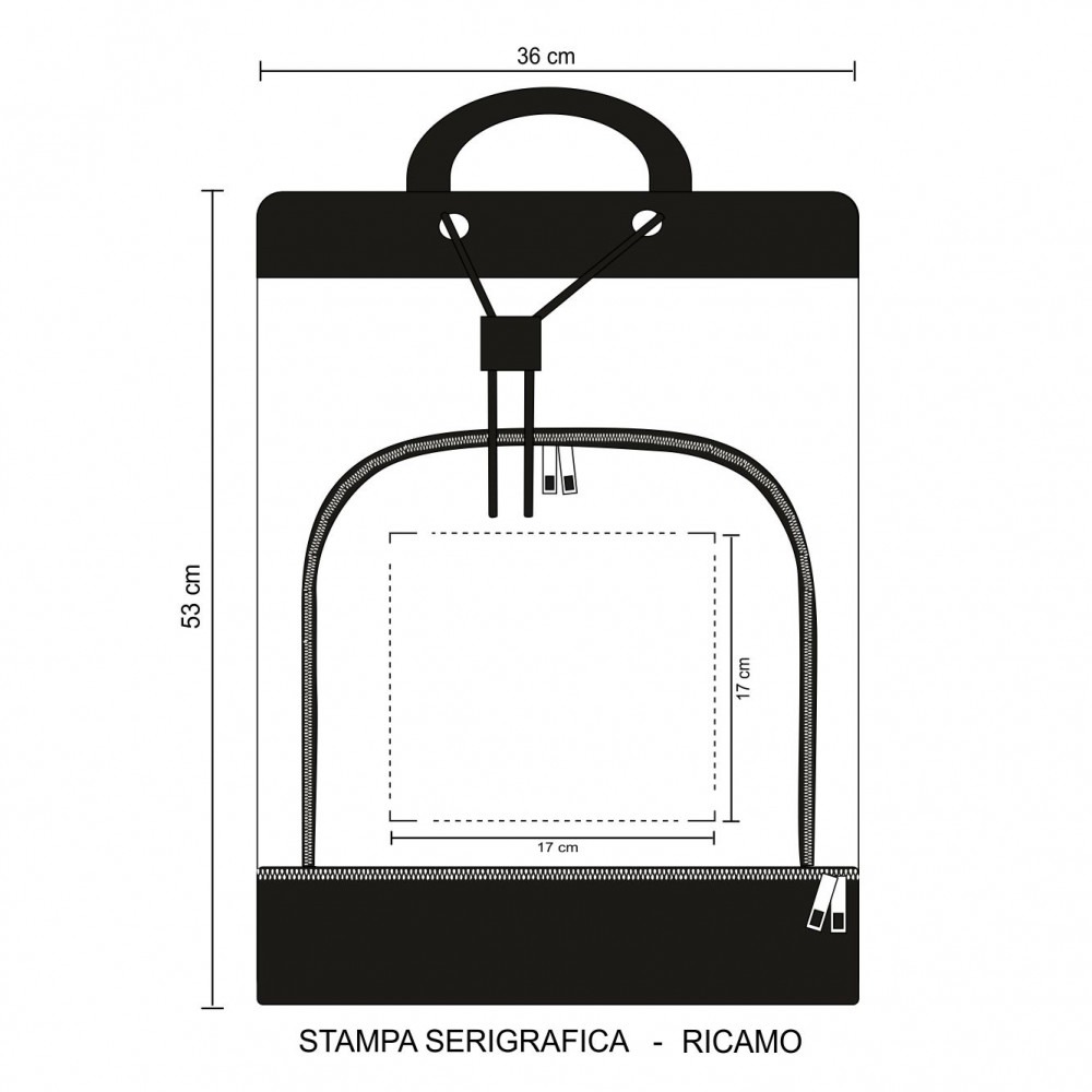 Borsa zaino in poliestere 600D.Tasca anteriore con zip. Chiusura con laccio regolabile. Corredata di manici e tracolle salva spalle, piedini antiscivolo, fondo con zip. Confezione in polybag. Colori: blu, nero, rosso, verde, fuxia. Dimensioni cm 36x53x25 Imballo: 20xcolore